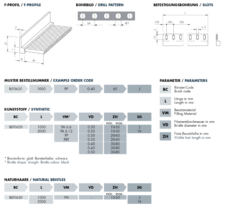 Die folgende Tabelle zeigt unsere Standardmodelle der Lattenbürste mit Profil. Sie benötigen eine Bürste mit anderen Spezifikationen? Wir helfen Ihnen gerne mit einer maßgeschneiderten Bürste. Auch wenn Sie noch unsicher sind oder eine Beratung zu einer Bürste wünschen, wenden Sie sich bitte an unser Verkaufsteam.